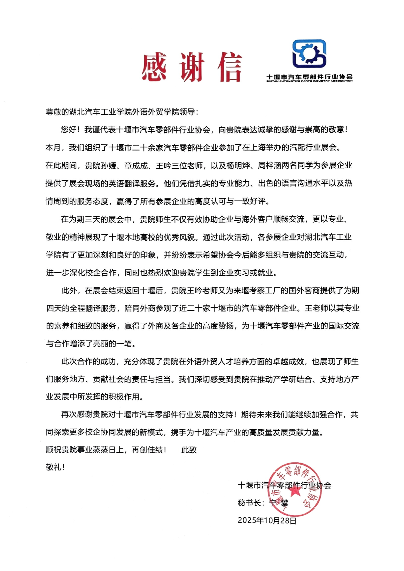 宁攀还代表十堰市汽车零部件行业协会送来感谢信。本月,协会组织了十堰市二十余家汽车零部件企业参加了在上海举办的汽配行业国际展会。在此期间,学院孙媛老师等五名师生为参展企业提供了展会现场的语言服务。他们凭借扎实的专业能力、出色的语言沟通水平以及热情周到的服务态度,赢得了所有参展企业的高度认可与一致好评。